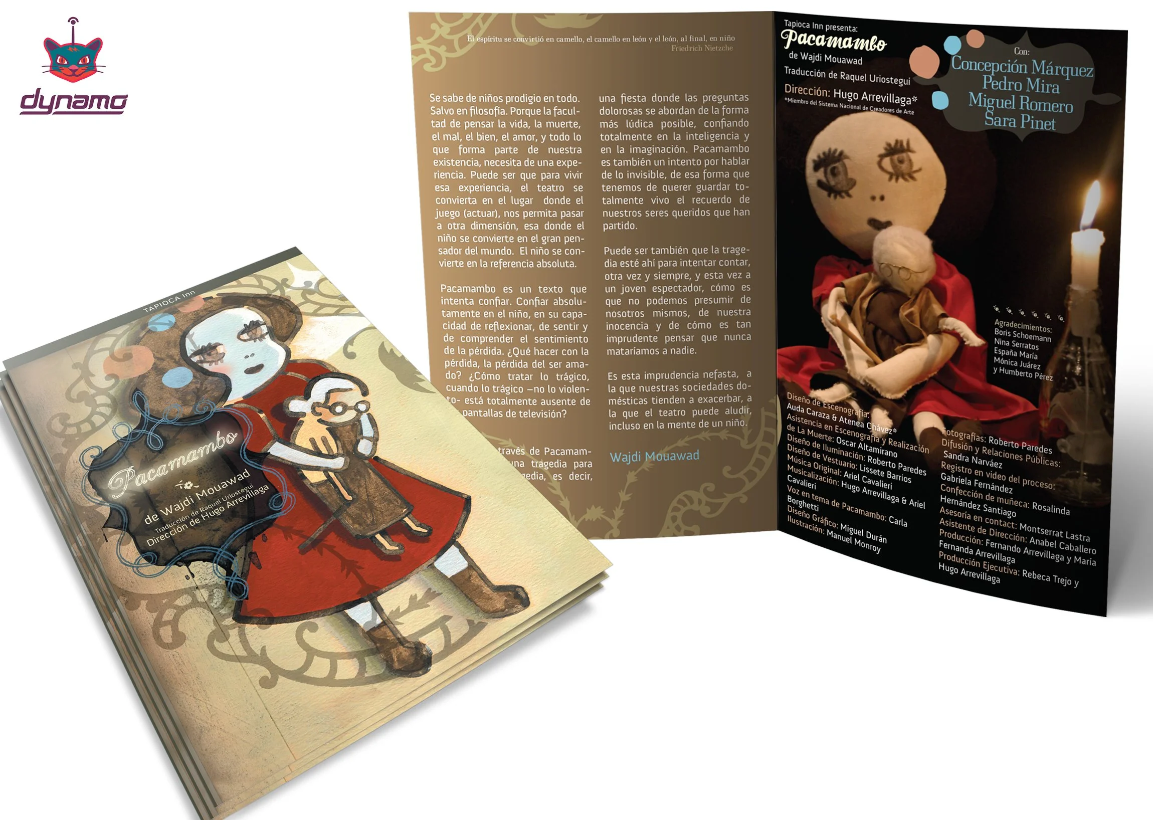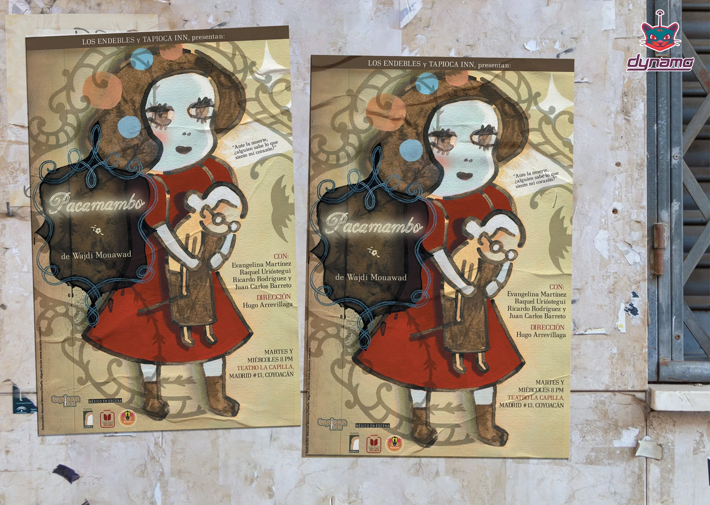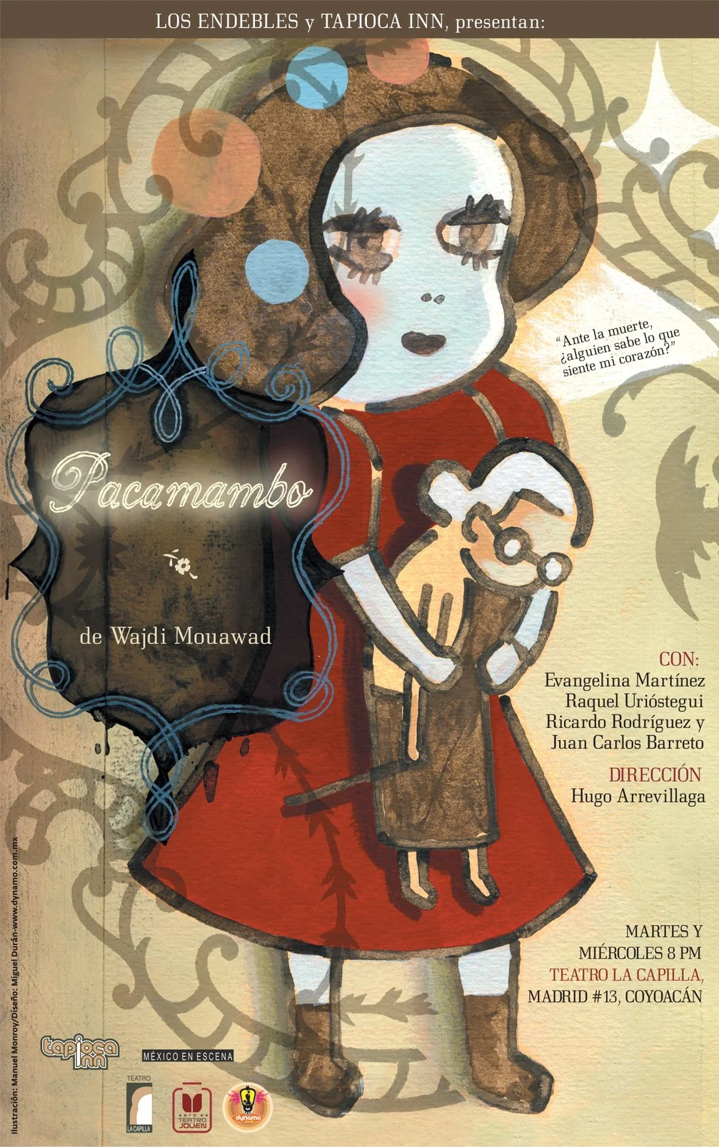 Cartel para la obra de teatro Pacamambo de Wadji Mouawad, dirigida por Hugo Arrevillaga. Compañía Tapioca Inn. Ilustración de Manuel Monroy.